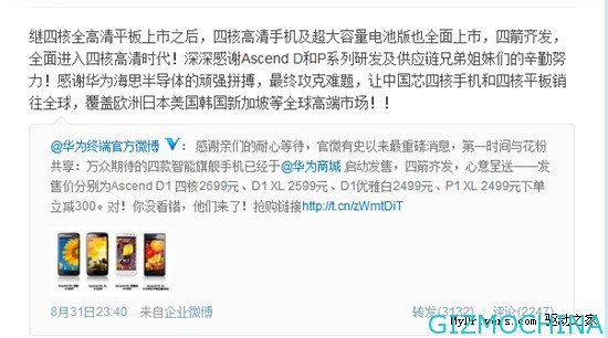 Huawei D1 quad-core is preparing to be sold at 2,699 yuan, this device will be available in the market on September 12th, while D1 XL will be sold with 2,599 price tag and will be shipped on September 9th, and D1 Elegant White will be sold at 2,499 yuan, while P1 XL will be sold with 2,499 yuan proce tag, all that device will be shipping on September 9th.