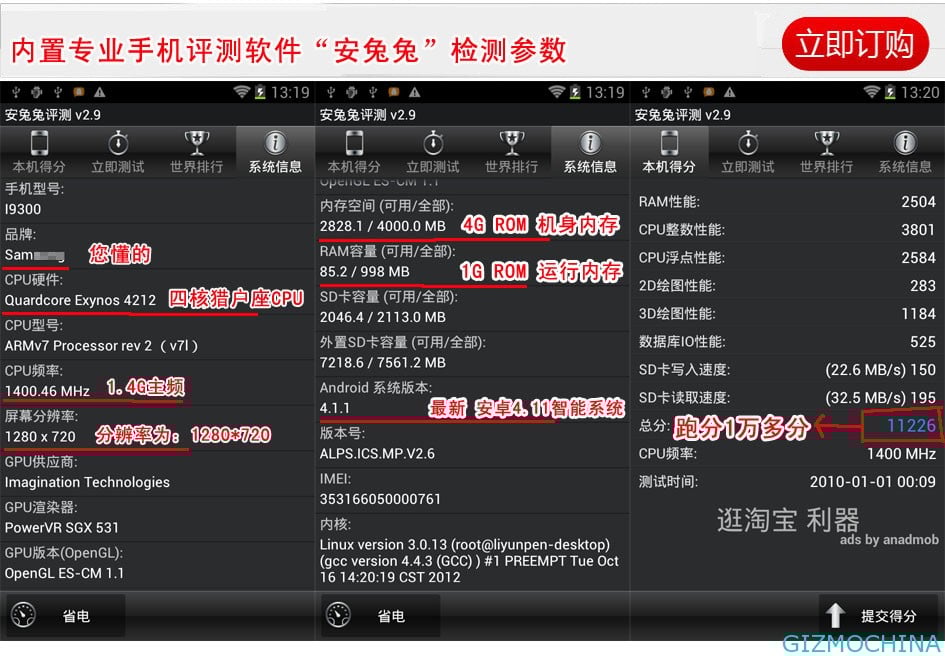 The S9 comes with different memory sizes, 8gb, 16gb as well as 32gb. It is boosting a Quad-Core Exynos 4212 Cpu with cortex ArmV7 with a clocked speed of 1.4ghz