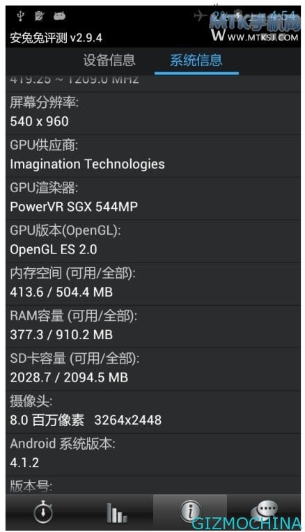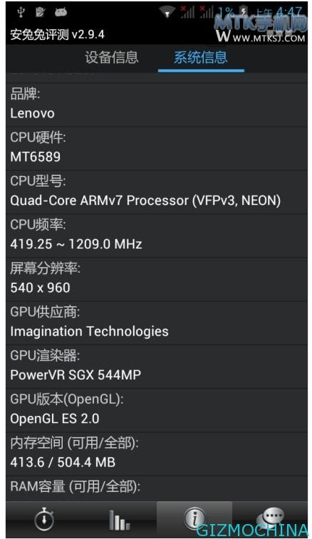 From the screen shot of Benchmark test, we see the brand product is Lenovo, using hardware processor MT6589, running at 1.2GHz clock speed, a screen resolution of 960 * 540 QHD, graphics processor and had handed out information consistent, MTK6589 indeed built-in PowerVR SGX 544, 1GB of RAM, along with 8 megapixel camera. The run sub phone is not weak, about 9800, but I believe there will continue to optimize the space.