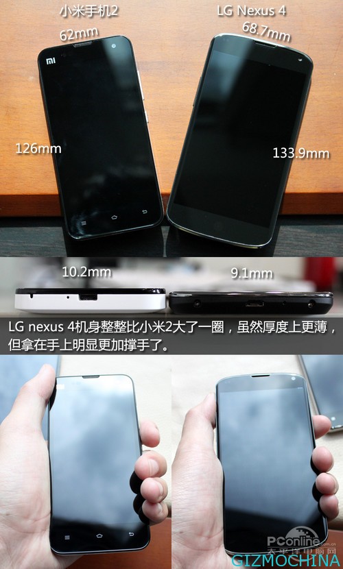 Wile the Google Nexus 4 has larger screen size than Xiaomi MI2, because Nexus 4 has 68.7mm wider than Xiaomi MI2 which only has 62mm body wide. Although the thickness is different only 1mm thinner, while personally both phone feels comfortable in hands.
