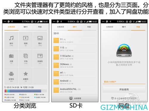 The MIUI V4 system comes with the program which can still easily visible. Theme libraries become more intuitive and convenient operation, and the growing number of online theme, after a long time of development, the number of very rich theme. The classification file manager view is also convenient to the users to quickly summarized the file, find it easier, and joined the now popular network disk simply use millet log in to. Secondly, the music program has changed the main colors, the more lively, swinging to switch songs, online music content becomes more substantial.