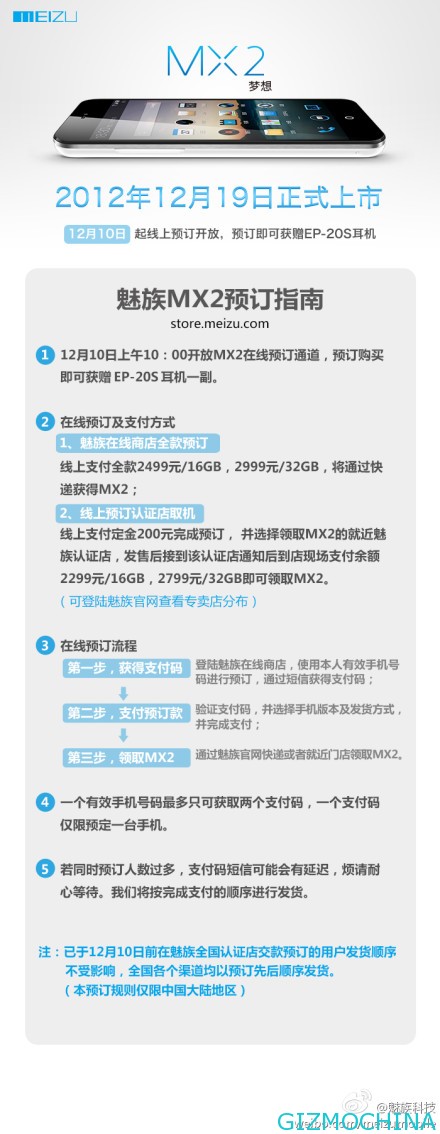 At 10:00 am on December 10, Meizu’s official website will open pre-orders of the phone MX2, buyers are required to provide 200 yuan as down payment and get a ticket that can be redeemed at the time of the phone is available and pay the rest of payment available, please go to Meizu.com website.