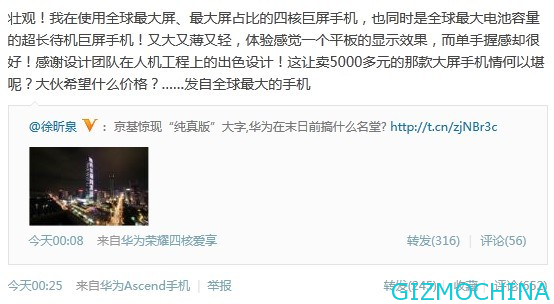 Earlier today, the chairman of Huawei Samrtphone Yu Chengdong on the microblogging said they are using the world’s largest mobile phone, although it is very thin and light, but has a comfortable on single hand, of course, the real effects are great.