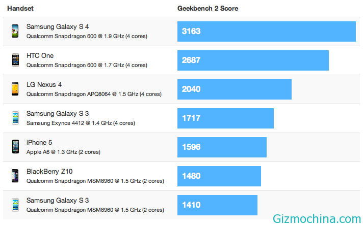 The soounds is very amazing right?, The Primate labs has doing some research and benchmark test using GeekBench 2, the Samsung Galaxy S 4 has been compete with another Android device, BlackBerry Z10 and iPhone 5. On the GeekBench benchmark tools, the higher scores is better.
