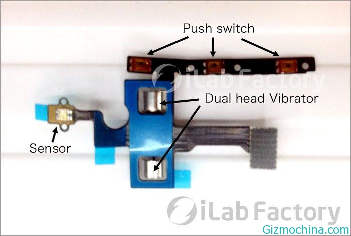 The leaked images of a vibrator/audio control flex cable, a home button flex cable, and a front camera flex cable. Observing the vibrator/volume control flex cable, it appears that all three buttons are push buttons suggesting that the mute switch on the upcoming iPhone may actually become a push button.