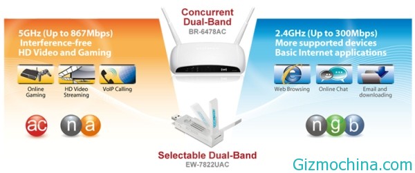 AC1200 Wireless router (Model: BR-6478AC) is equipped with a Gigabit LAN port, four Gigabit LAN ports and two dual-band antenna 3dBi. While 802.11ac USB 3.0 adapter (Model: EW-7822UAC) is the fastest USB WiFi adapter in the world. To achieve maximum speed, the adapter must be connected to USB 3.0. The adapter is powered by folding antenna that can be customized and integrated to optimize the performance of existing WiFi.