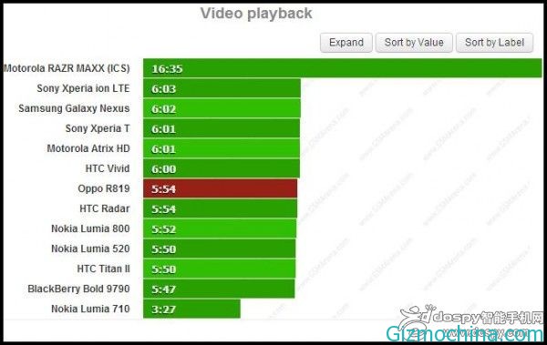 The video playback time was virtually the same as the web browser test, just under 6 hours. The Desire 600 managed about an hour longer, the Grand Duos lasted another hour more, while the Galaxy S4 mini duos came in close to the top with over 13 hours. The Oppo R819 screen is great for videos and the video player has extensive video codec support, but it’s not very power efficient.