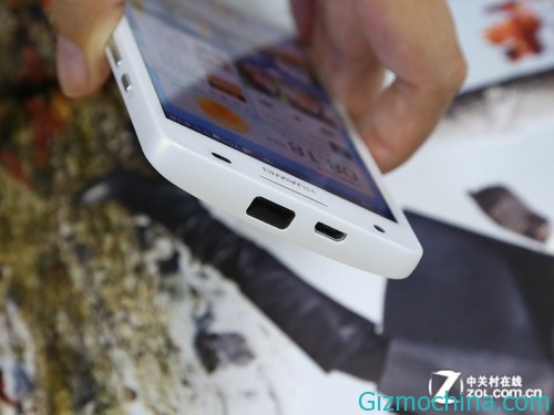 Huawei Honor 3 buttons are located on the right side of the fuselage, the power key and the volume key up or down to set. This design is very user-friendly, although Huawei Honor 3 screen size is moderate, but compared to the top, or right buttons for easy one-handed operation several more. Then there is the Huawei Honor three rather special place, at the top we can see the data interface of a black box, here is actually Huawei Honor three infrared. That Huawei Honor 3 can be used as a remote control to remote control home appliances in our homes, which we will explain in the back. Also Huawei Honor 3 headphone jack located on the bottom, through the headphones plug to achieve waterproof and dustproof effect.