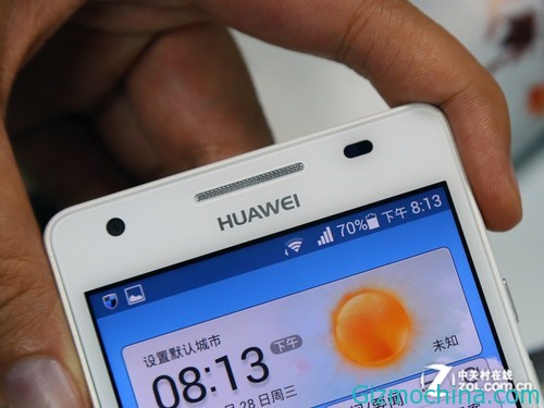 White fuselage Huawei Honor 3 front panel also maintained consistent with the cover and the white border, through a piece of Corning Gorilla 2-generation glass to protect the cell phone screen. Huawei Honor 3 simple continuation of a consistent design style, nor blindly follow the trend of ultra-thin, feel very original, because the screen is relatively modest, the phone is also quite portable.