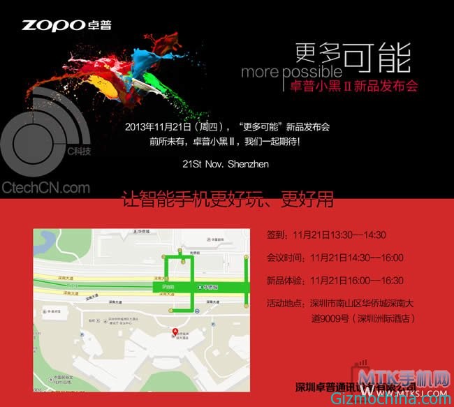 There is also invitations card exposure, demonstrating the conference to show Zopo Black II smartphone at 13:30 on the November 21st starting at Intercontinental Hotel in Shenzhen. Meanwhile invitations using red and black contrast color, color paint left there, does that mean there will be more black two generations colors? there is also the word “more fun for smart phones, better use”.