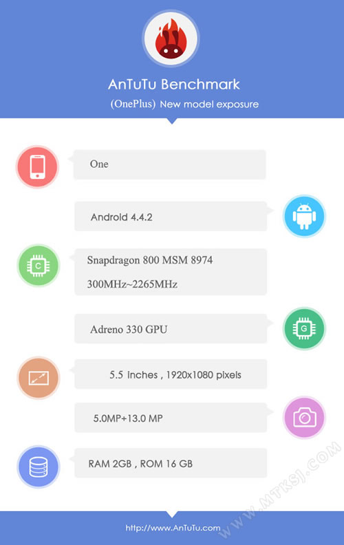 And now we got another leaked information about the phone that the phone will has 2GB of ROM and 16GB of internal storage, while the recent rumor is says that the OnePlus One will powered by Snapdragon 801 processor but in the Benhmark test, the phone is powering up by Snapdragon 800 MSM 8974 300 Mhz ~ 2265MHz processor.