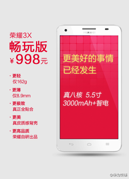 Before this, the Huawei Honor 3X is offers with 1698 yuan price or around $275 USD. Huawei Honor 3X has the top-notch hardware configuration, the phone has lighter body with only 162gr and also has a thinner body with 8.9mm, but the screen size is using the same 5.5 inch screen size, the screensize is similar with RedMi Note. While it’s phone is powered by 3,000 mAh battery life