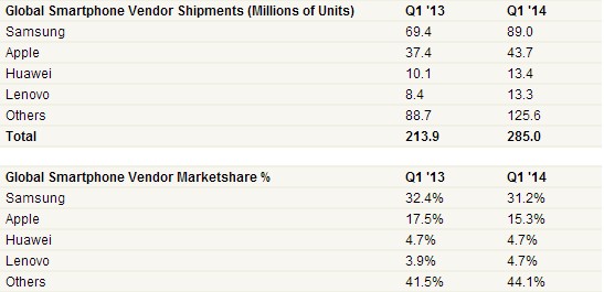 According to the recent data released by Strategy Analytics, the smartphone market continues to expand. The shipments that have been allocated around the world are 33% higher in the first quarter of 2014 than they were in the last quarter of 2013. This means 281 million more smartphones are in circulation!