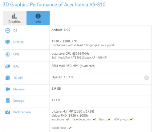 Today another yardstick was set as yet another Acer tablet was made public in an illegal way. The straight leaks related to 7.9 inch Android tablets with Intel Bay Trail processors, the details of a model MediaTek octa-core CPU are available on GFX Bench website. They call it Acer Iconia A5-810 and with the description it looks like a pretty interesting device. The tablet has a touch screen display of 7.9 inch, 1920 x 1200 pixel, a MediaTek MT8392 ARM Cortex-A7 octa-core CPU, and ARM Mali-450 MP4 quad-core graphics. RAM of 2GB, 16GB storage, 5MP main camera and 2MP front facing camera, Wi-Fi, Bluetooth and GPS all are features of Acer Iconia A5-810. It runs on Android 4.4.2 Kit Kat software. Acer has not declared officially this tablet or any other similar-sized Intel models that we have seen in past. So it is more likely that someone at the company could be setting criteria on internal sample devices that were never supposed to be made public. But it is also possible that Acer plans to set in motion a series of 7.9 inch Android tablets very soon, possibly with variety of price range and to target various markets.