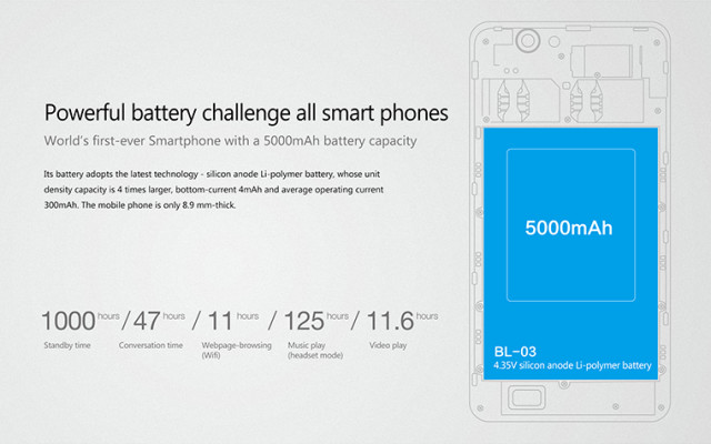 THL 5000 although has a big battery, but the phone’s size still be controlled at 8.9mm thickness (the dimension is 144.9×72.3×8.9mm). According to THL claim, the THL 5000 has ability of 1000 hours of standby time, 47 hours of talk time, 11 hours web browsing, 125 hours of music playback, video broadcast 11.6 hours.
