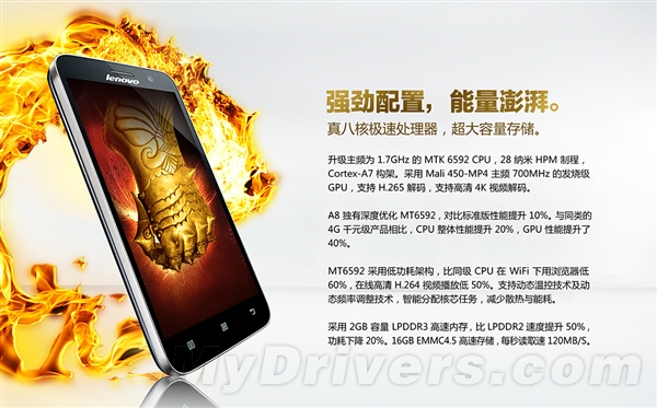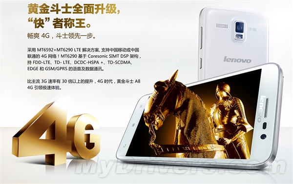 Lenvoo A8 is comes with 5-inch screen size with 720p resolution, the phone is also powered by 1.7GHz MT6592 octa-core processor, and support FDD-LTE and TD-LTE 4G network.