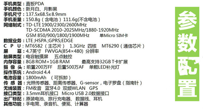 One of the good things about the Gionee GN151 is that it uses a combination of the MT6582 quad-core chipset and MT6290 frequency band chip. It also sports a 4.7-inch display screen with FWVGA resolution (854 x 480), 1GB RAM, 8GB ROM, a 2mp/5mp dual-camera, and sensors like an electric compass. It is powered by a 1800ma battery and supports dual-frequency WIFI.
