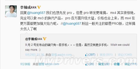 Last night, Li Nan, the vice CEO of Meizu confirmed on Weibo that only the MX4 will be released at the annoucement on September 2nd, which means we’ll have to wait a little bit longer for MX Pro.
