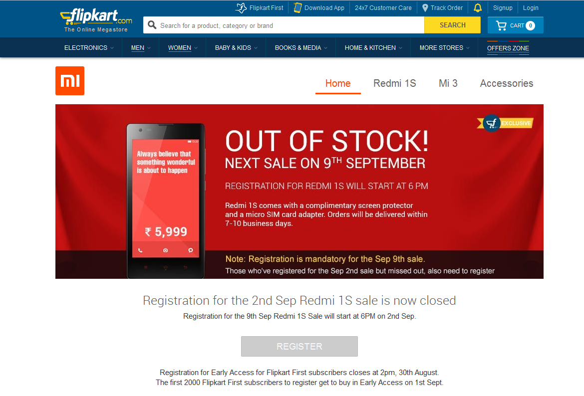 This time again, it was just a game of few seconds for Xiaomi. Xiaomi Redmi 1S was released for Flash sale in India today i.e. 2nd September 2014 in India on Flipkart.com. It is not surprising at all that the Xiaomi Redmi 1S sale ended in seconds. The Flash sale of this android smartphone started exactly at 2:00 pm and it was no wonder that the sale closed at 2:01 pm. The Xiaomi has launched this smartphone as a tough competitor to the Motorola’s Moto E. But the Redmi 1s has all the features of much loved smartphone Moto G. The strategy of Xiaomi of lowering the price of Redmi 1S from Rs 6,999 to Rs 5,999 has been proved favourable. The Flipkart.com has started the registration of Redmi 1S in India on 26 August 2014. The registration was open for 5 days and according to Flipkart 250,000 people registered for this flash sale.