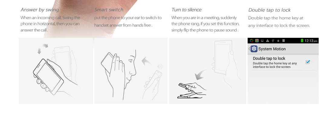 When you receive a call you can answer it by simply putting it close to your ear or even by swinging it horizontally. And if you want to silence a call, just place the phone on the table with the screen below and your phone will be silenced.