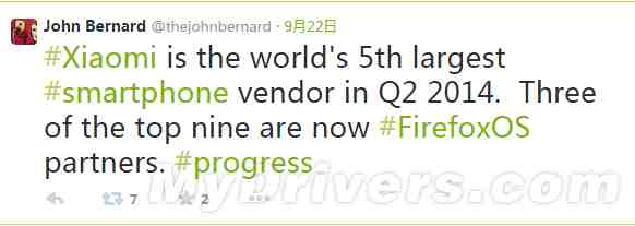Recently, Twitter user, John Bernard, called Xiaomi the “fifth largest smartphone vender in Q2 2014” and that “three of the top nine” manufacturers “are now Firefox OS partners.”