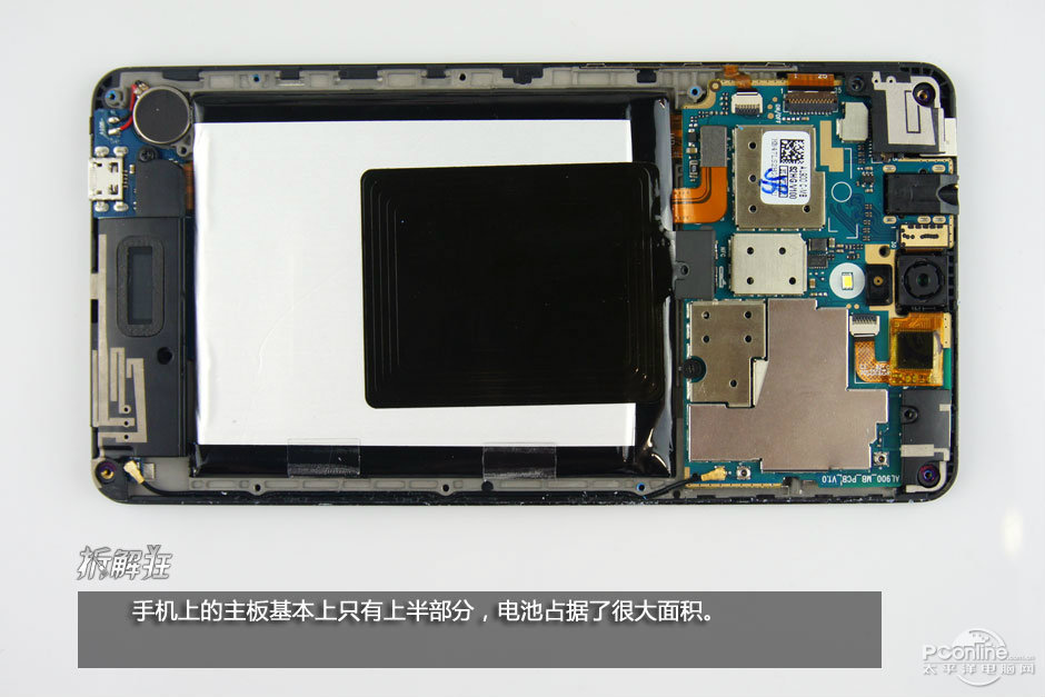The motherboard is located at the upper half of the phone where the battery takes up the most space.