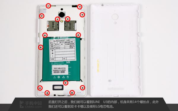 We could see the inside of U3 after remove its case. There are totally 14 screws fixed with the back. We could also see dual SIM card slot and LG battery.
