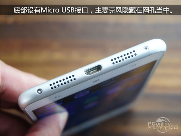 The Micro USB port is located in the middle of the bottom part. Beside it are two sets of holes, one of which is the speaker.