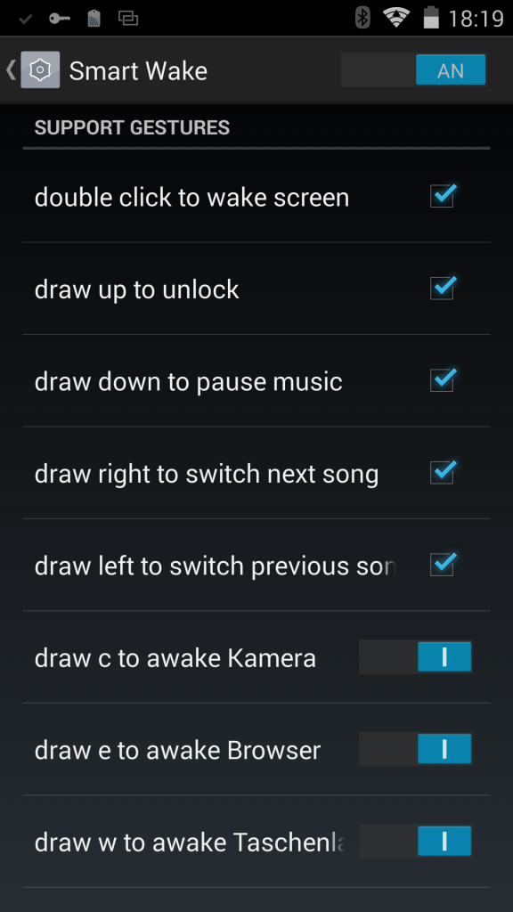 I like to use the Smart Wake Function. With a double click on the turned off display I wake the ZP999 Lion Heart and write „C“ on the display to use the camera, with „W“ I can use the torch. You can define the applications manually.