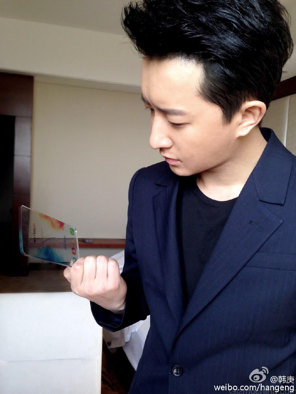 Today, pop star, Han Geng, released a photo in his Weibo account that shows what is purportedly the upcoming Coolpad Dazen X7 high-end phone. As the photo shows, the phone is completely made of glass. The Dazen X7 is this year’s flagship phone for Coolpad’s Dashen subsidiary, and Han Geng is the first to post a photo of it. The Coolpad Dazen X7 will make its debut on January 8 and may cost around 5000 RMB (807.04 USD). It may be the first ever cell phone to be made entirely of glass.