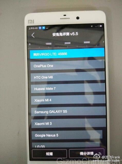 As for the tech specs, the phone is reportedly running on a Snapdragon 801 processor, the same one that’s currently inside the Xiaomi Mi4 clocked at 2.5GHz. The overall body frame is said to be made of aluminum alloy and is much thinner than the existing flagship. In the AnTuTu benchmark test results, the phone secured a score of over 46866 points, which is almost 4000 points higher than the average score of Mi4 (42000). This ranks it higher than other powerful flagships like the OnePlus One, Galaxy Note 4 and the Galaxy Alpha. Only the Nexus 6 and Meizu MX4 are have scored above 46000 points.