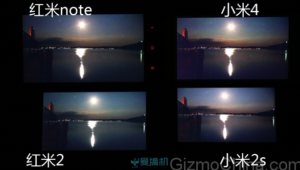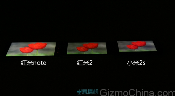 In a brightness comparison test by igao7.com, it can be seen that the Redmi 2 (lower left) has an overall whiter display compared to the Redmi Note (Upper Left), the Xiaomi Mi 3 (Upper Right) and Xiaomi 2S (Lower left). The screen displays on the predecessors appear to have a reddish warm hue to them.