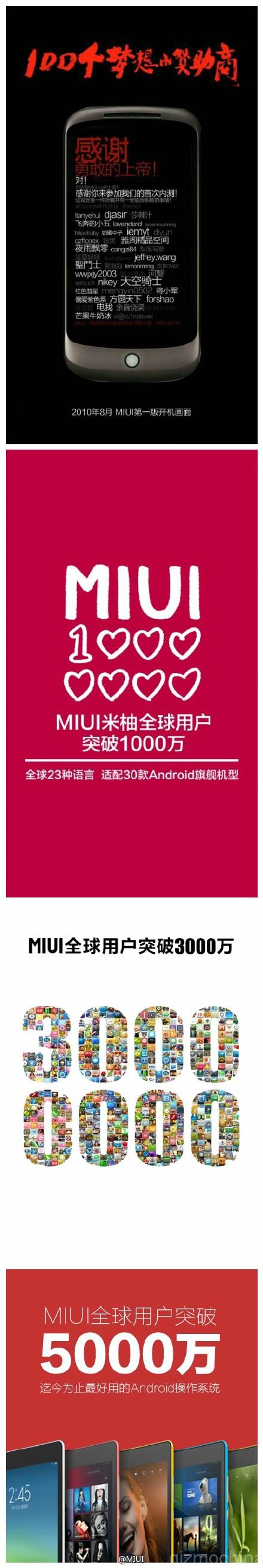 The company on its weibo page revealed that MIUI had hit 30 million in December 2013 and 50 million in May 2014. Then there’s a blank for the figure that’s going to be announced tomorrow, which will be 100 million users!