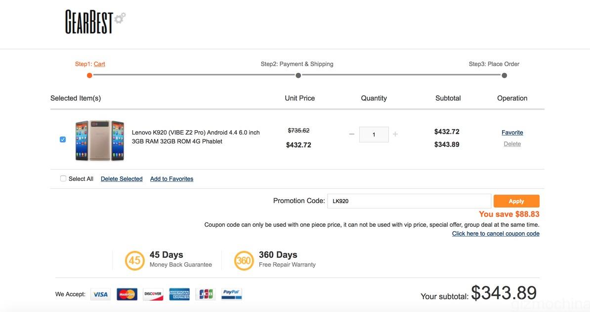 Once the Lenovo Vibe Z2 Pro (K920) was launched, it was ridiculously overpriced via resellers. However, right now it can be purchased for as low as $343.89 from Gearbest using the PROMO CODE: LK920. It seems that the deal is valid only for Gold and Black versions.