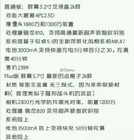 The leak further reveals that the Mi5 will come with a 5.2-inch 2K LCD display and a 16MP rear sensor along with a 13MP front facing camera. As for software, the phone is rumored to come with the new version of MIUI, the MIUI 7 which reportedly features floating screen UI. We expect it to be based on Android 5.1 Lollipop version.