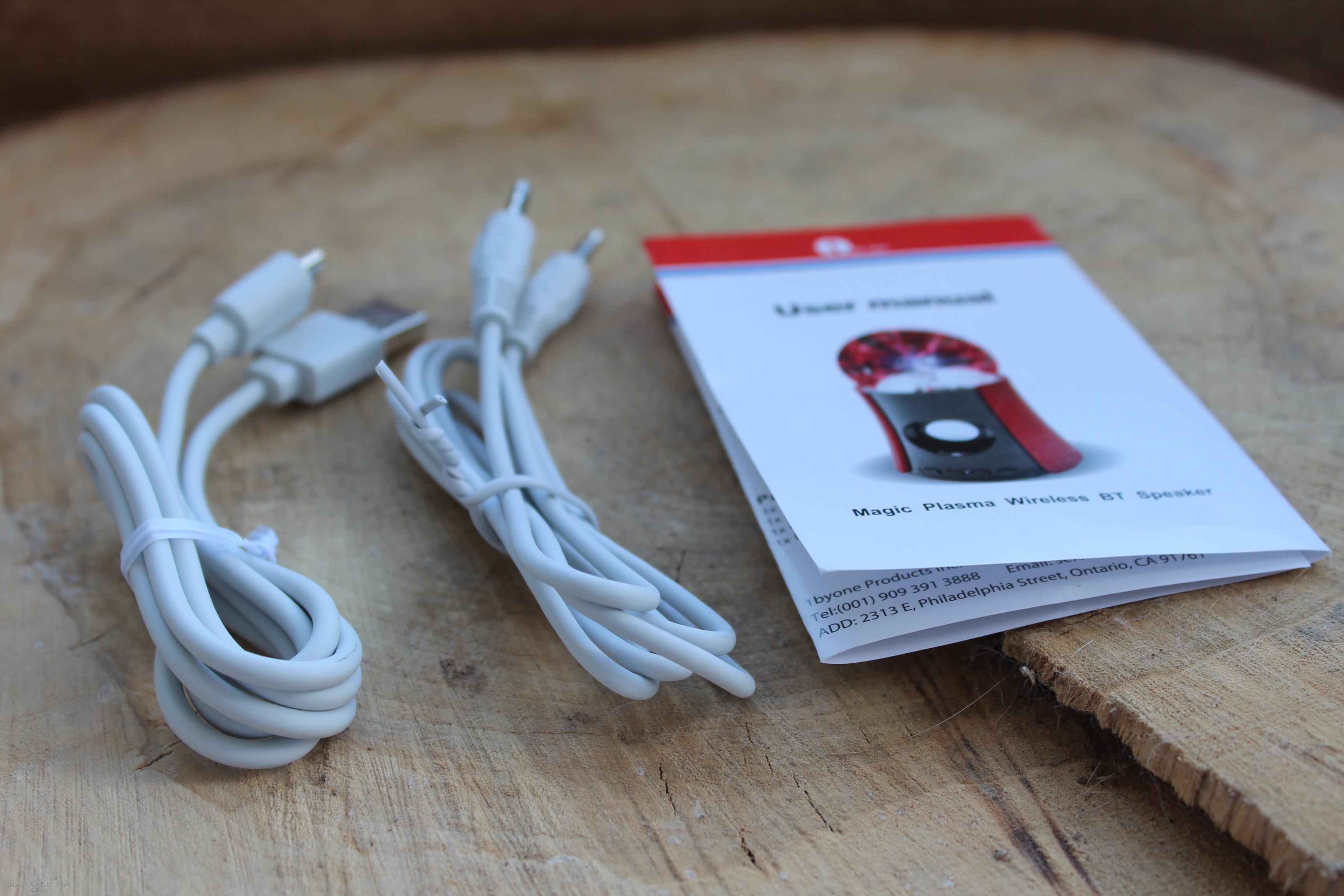 The device comes with a micro USB and AUX cables and some instruction manuals.