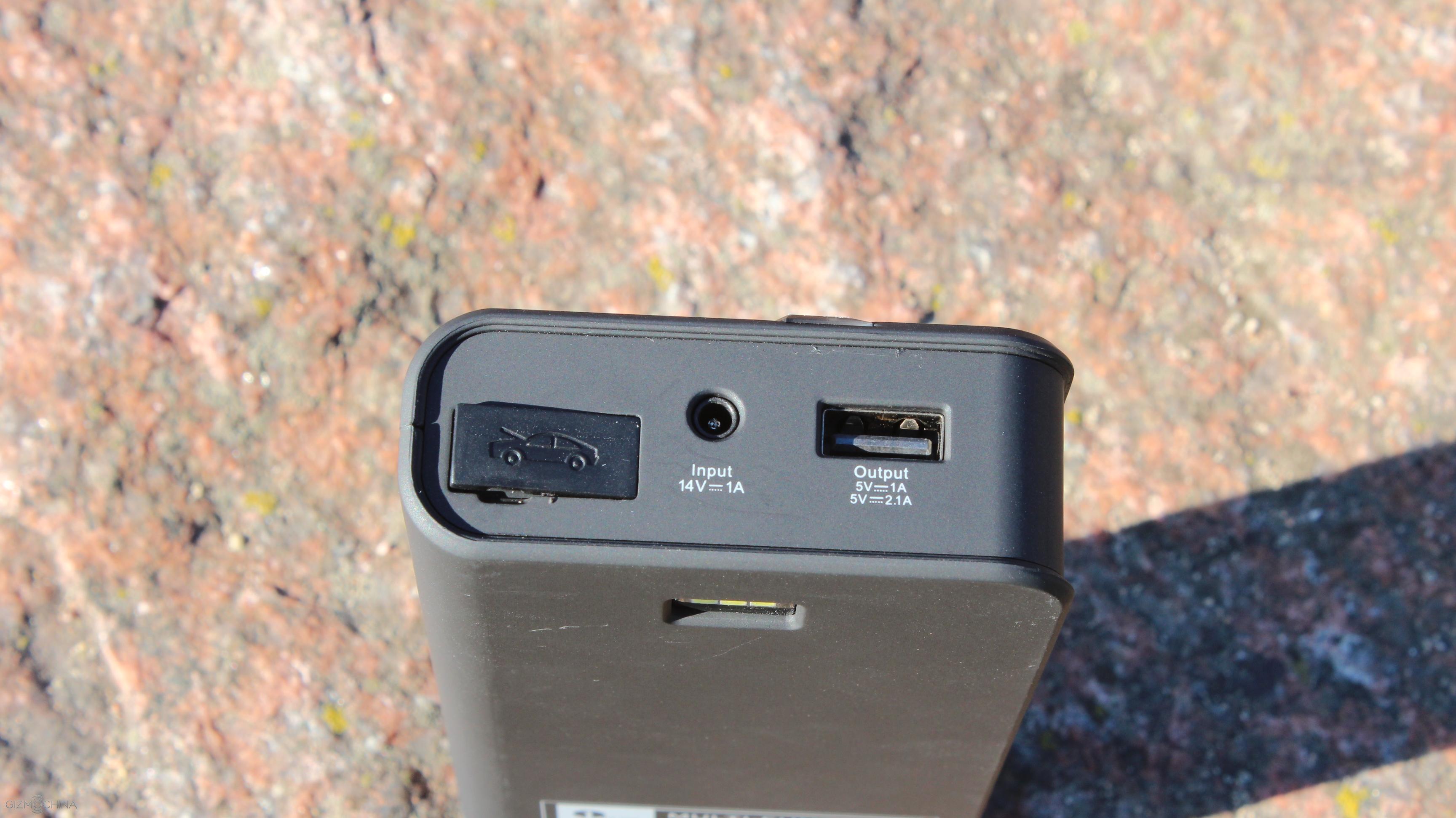 On the top we have output ports for the car jump starter cables and the USB port, which lets you charge any USB powered devices.