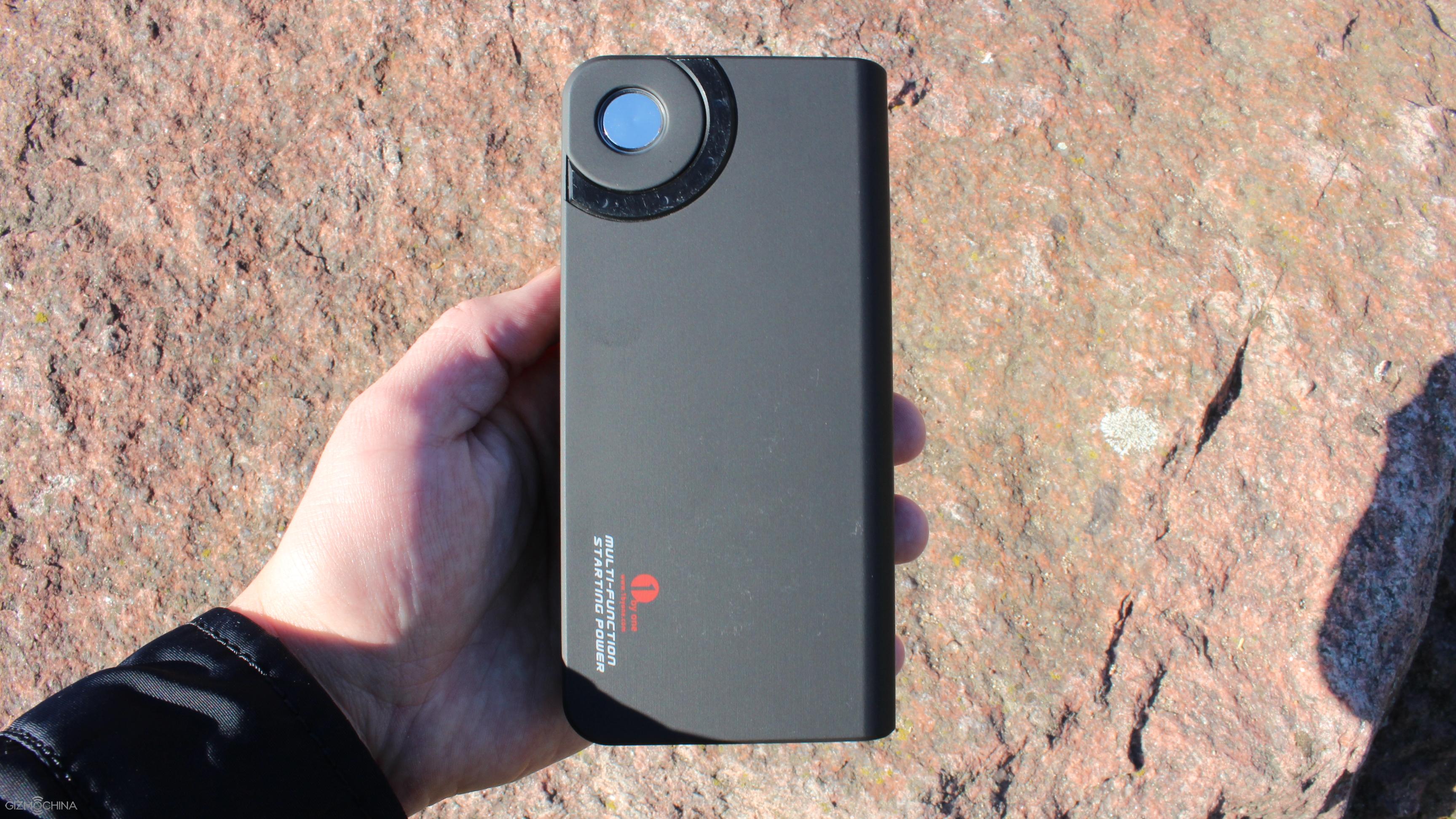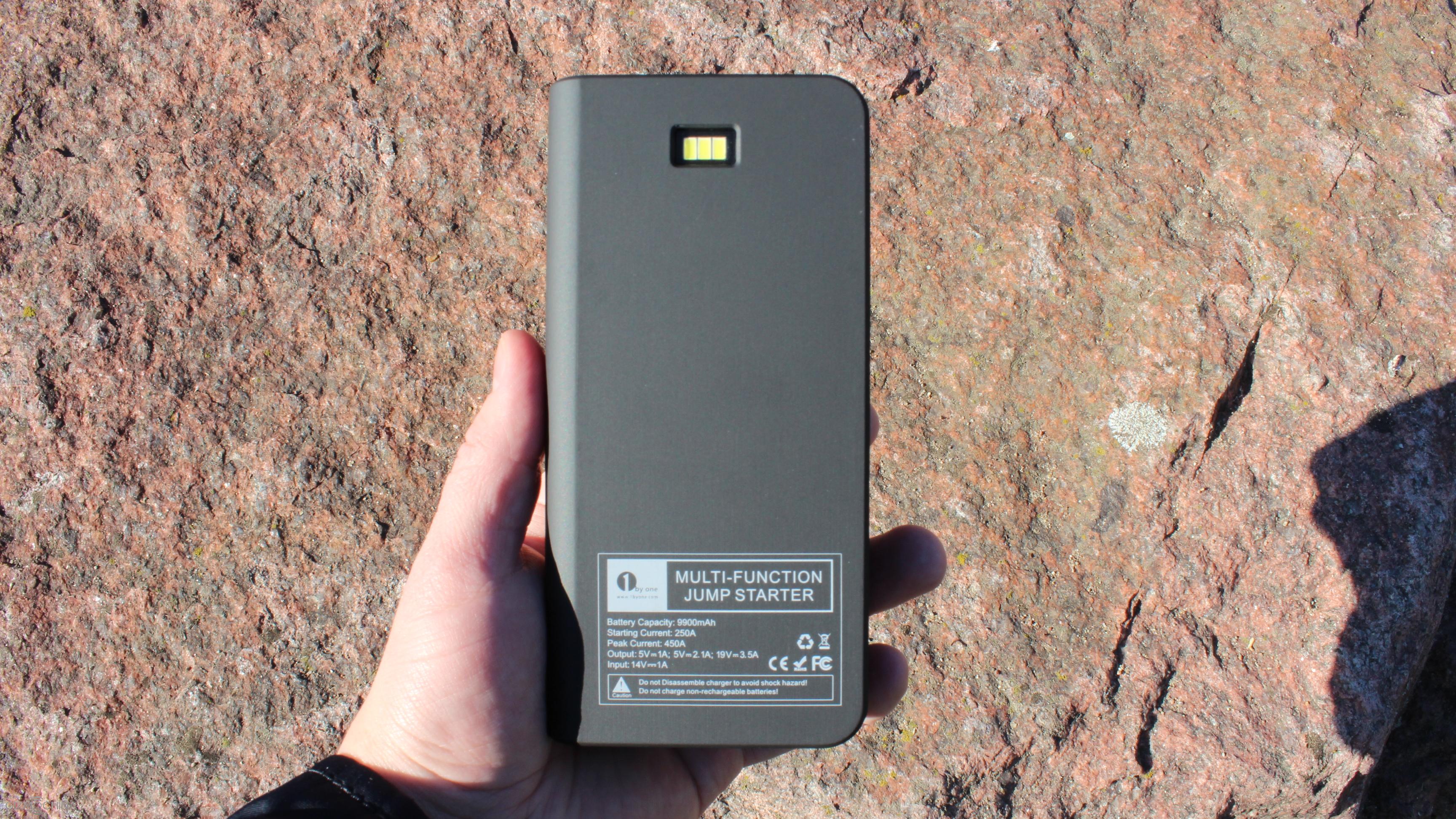 The 1byone car jump starter is made of rubberised plastic and on the front side we have a power switch with the LEDs, which show the amount of juice left in the battery.