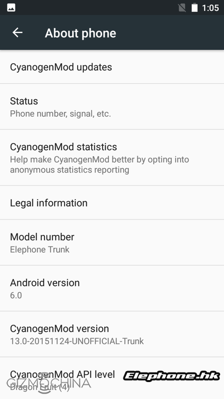 The first Rom and the Rom that will certainly be getting a lot of attention from custom Rom installers like myself is the Elephone Trunk port of Cyanogenmod 13 the build date for the Rom is 2015-11-24 just over a week ago. the Rom is based on Android 6.0 making the Trunk one of the first phones from China to run the latest Marshmallow OS.