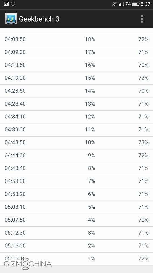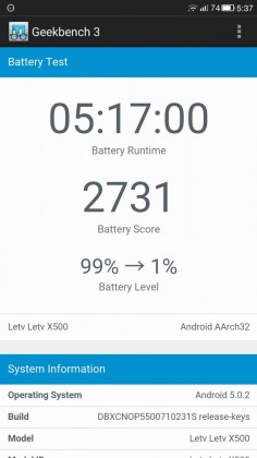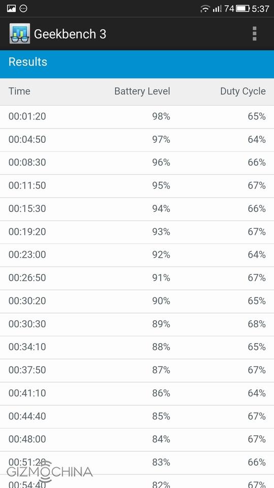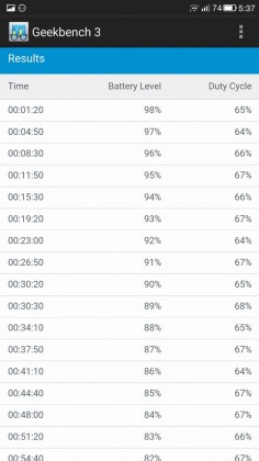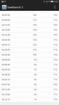 The 3000mAh battery could perform better. I could get only around 3 hours of screen-on time (SOT) in real life conditions while using the phone mainly for daily tasks. The SOT time is a bit better in the Geekbench 3 battery test, where the phone was able to achieve over 5 hours of SOT with max. auto-brightness and dim screen features off.