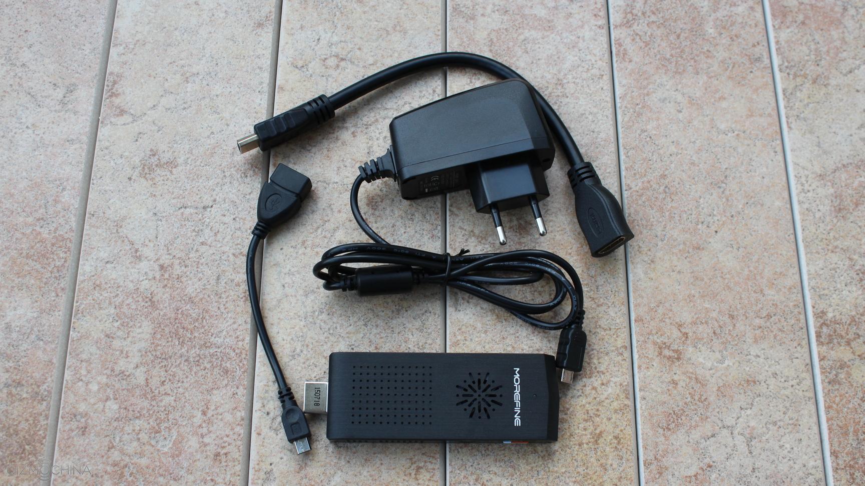 The Morefine M1+ mini PC comes with the power plug, HDMI extension cable and USB OTG cable.
