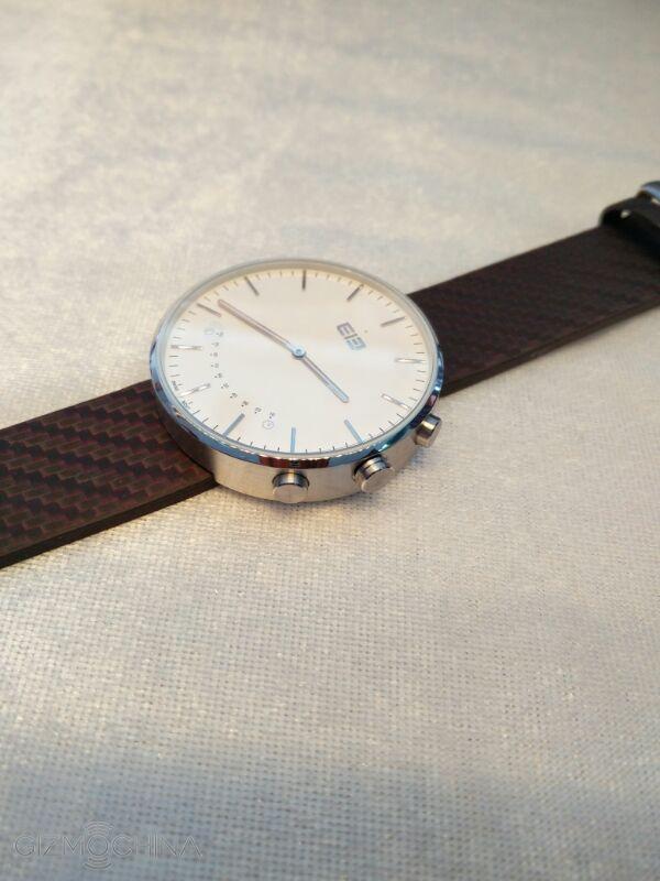 This wearable is unlike the usual smartwatches that you have seen in the market. The first major difference is the lack of a display up front. So, the W2 is like a traditional watch with some smart features. It’s a round watch with traditional dials and numbers and three physical buttons on the right.