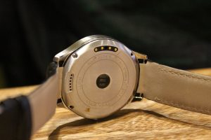 The back is simple and features the heart rate sensor, speakers, and the charging pins. Remove the four screws and the back plate comes off revealing the SIM card slot. Everything is pretty well built and in the design, you will find no complaints. Even the sheepskin leather strap is comfortable and goes well with the overall design.