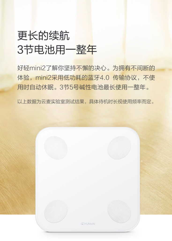 Further, the Yunmao Good light Mini 2 smart body scale uses a low-power Bluetooth 4.0 protocol which turns off automatically when not in use. The scale is powered using three AA batteries whcih can last up to a year wihout dying.