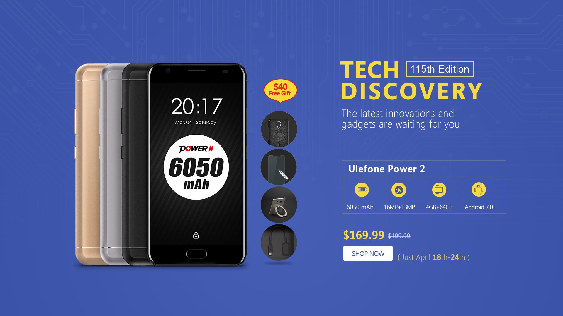 From now till the 24th of April, you can get the Ulefone Power 2 for $169.99 and also get $40 worth of free gifts. After the 24th,the price goes back up to $199.99.