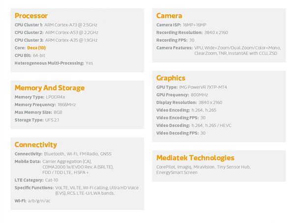 Specs wise, the Helio X30 use two 2.5GHz Cortex-A73 cores and four 2.2GHz Cortex-A53 cores and four 1.9GHz Cortex-A35 cores. The highest baseband achievable is Cat. 10. The Helio X30 also comes with the PowerVRXTP-MT4 GPU clocked at 800MHz. The processor supports 4K screen, 8GB RAM, UFS 2.1 flash storage and more. You can watch the video from here.