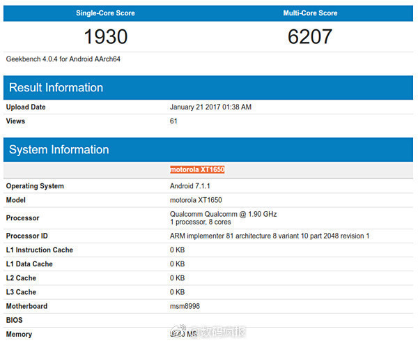 The device appears as Motorola XT1650 and in reality, there are lots of benchmark test for the Moto XT1650 listed on Geekbench’s database uploaded as far back as August last year. Almost all of the test show there is a Quad-core MSM 8996 motherboard, which is the Snapdragon 821 chip. But in a spectacular manner, the details contained in this listing include the MSM 8998 which is Qualcomm’s latest Snapdragon 835 chip. Secondly, this benchmark result is shown to have been uploaded on January 21, 2017. That again places some doubt over the benchmark result. However, the GeekBench database further shows that the Z2 features 4GB of RAM, Android 7.1 Nougat. The listing also shows the Z2 pulled 1930 points on the single core test and 6207 points on the multi-core test.