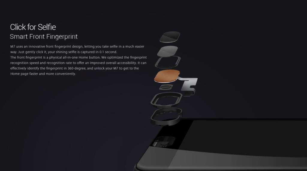M7 uses an innovative front fingerprint design, letting you take selfie in a much easier way. Just gently click it, your shining selfie is captured in 0.19 second.