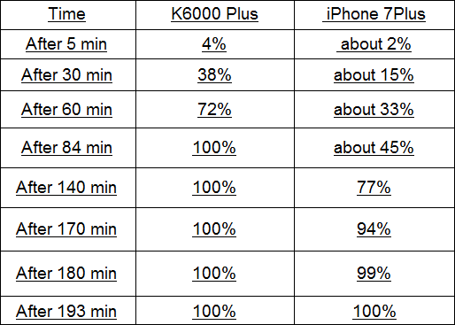 The test shows that even though the iPhone 7 Plus battery is only 2900mAh, it took more than 3 hours to achieve a full charge. On the other hand, the Oukitel K6000 Plus only took just 84 minutes to get its 6080mAh battery fully charged. In essence, if we are to use the iPhone 7 Plus’ 5V/1A charger to charge the K6000 Plus battery, it would take more than 6 hours to fully charge the huge battery. Thus that highlights the difference between a quick charge charger and normal charger.