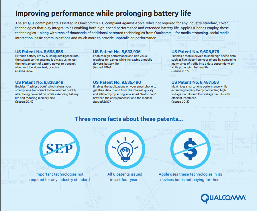 The six patents that Apple is said to be violating are related to optimized performance of battery, prolonging battery life while sending live video by creating data super-highway, network management and system performance. All the six patents were issued in the last four years. The images in this post are from Qualcomm which gives a breakdown of all the six patents along with details on each one of them that are being violated by Apple iPhones.